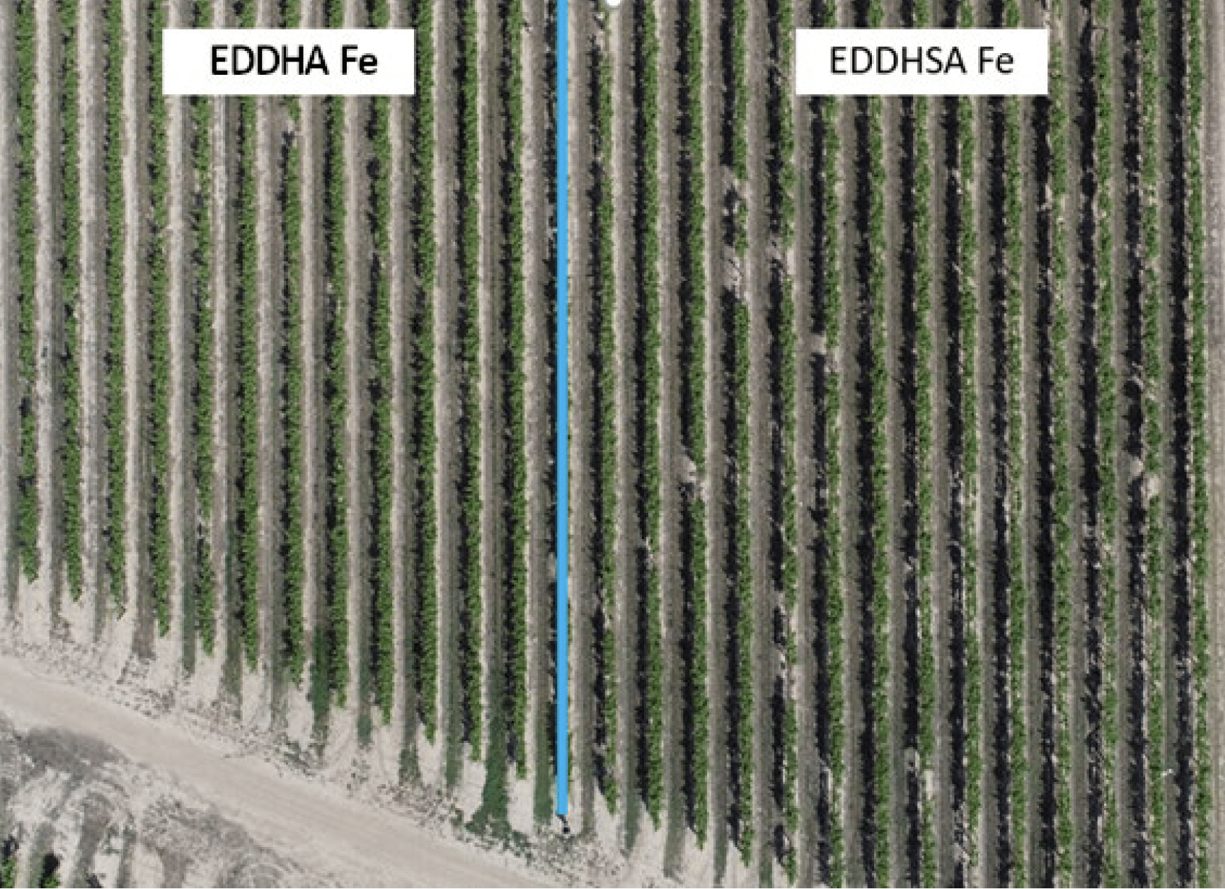 La vue aérienne montre nettement la différence de vigueur entre les traitements. À dose équivalente de fer chélaté, l’EDDHSA génère un verdissement plus intense, une canopée plus homogène et une réduction visible des zones chlorotiques. Cette uniformité traduit une disponibilité du fer nettement supérieure, confirmée par les mesures SPAD et l’analyse du fer assimilable dans le sol. Une preuve visuelle forte de la performance agronomique de l’EDDHSA en conditions réel et calcaires.