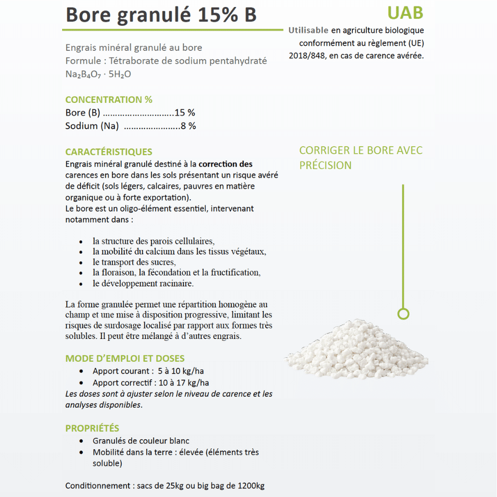 Le granubor est un engrais minéral contenant 15 % de bore (B), sous forme granulée. Il est destiné à corriger les carences en bore dans de nombreuses cultures. Sa formulation garantit une application précise et une libération progressive, adaptée aux itinéraires techniques agricoles.