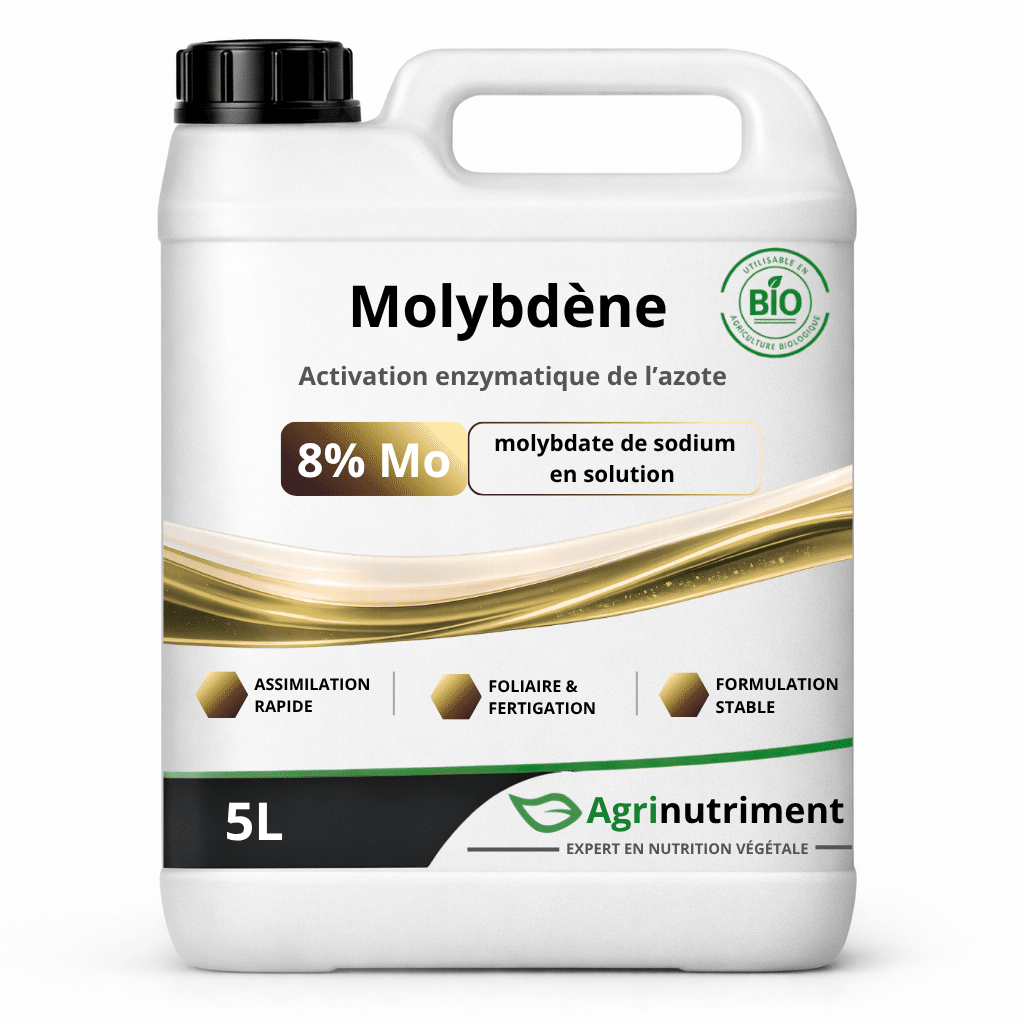 Le Molybdène 8% Mo est une solution concentrée de molybdène hydrosoluble formulée à partir de molybdate de sodium (Na₂MoO₄), titrée à 8 % Molybdène (P/P) soit 95 - 100 grammes de molybdène par litre. Entièrement soluble et rapidement assimilable, il constitue une source fiable de molybdène pour la correction et la prévention des carences sur l’ensemble des cultures agricoles.