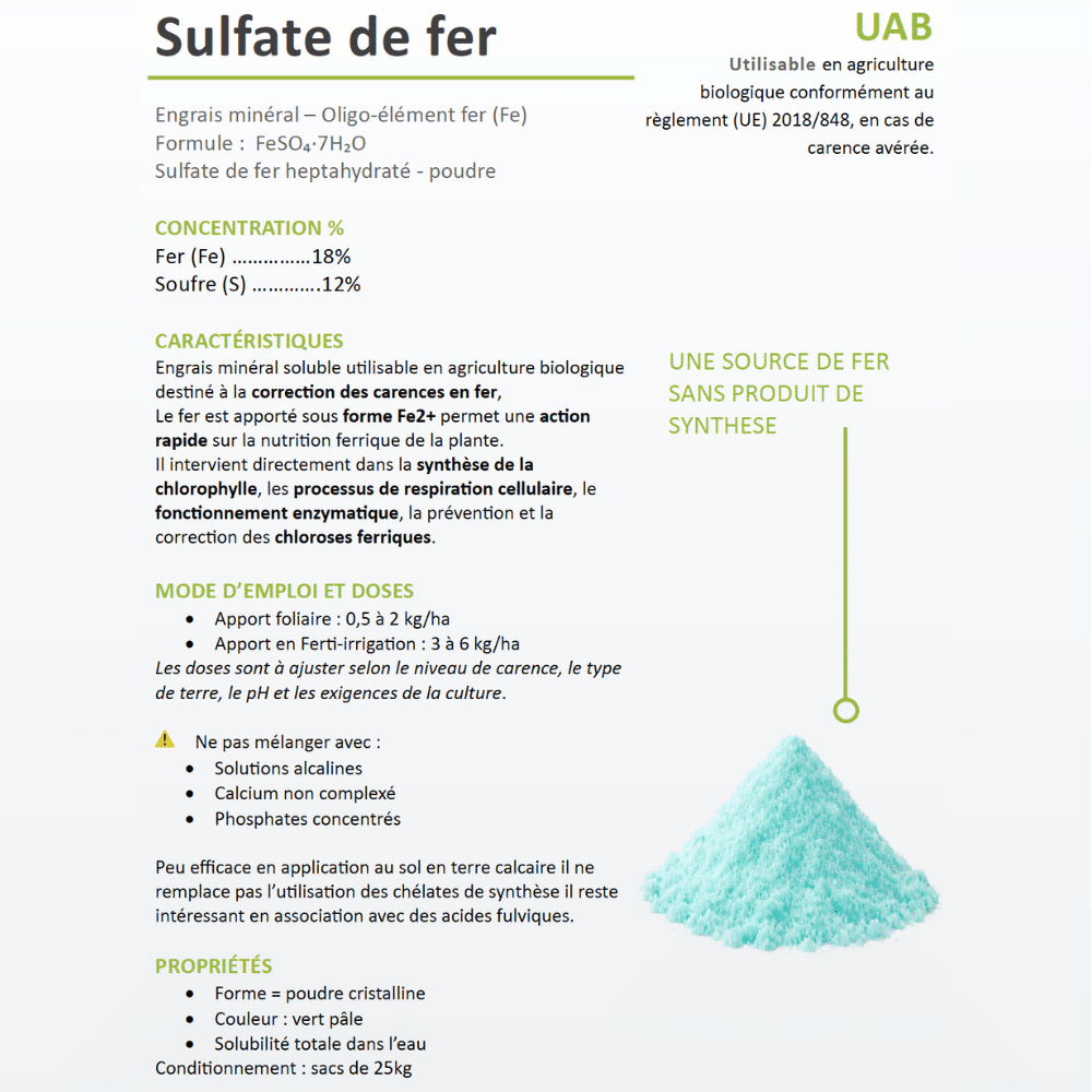 Le sulfate de fer heptahydraté (FeSO₄·7H₂O) est un amendement minéral destiné à corriger les carences en fer (chlorose ferrique) chez les cultures sensibles. Il constitue une source concentrée de fer ferreux (Fe²⁺), forme assimilable par les plantes, ainsi qu’un apport complémentaire en soufre (SO₃), bénéfique à la nutrition azotée.
